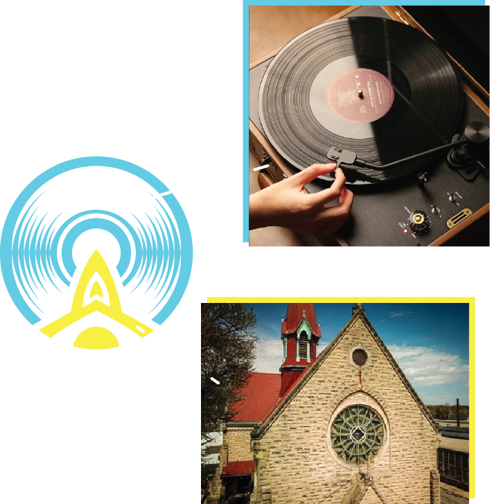 The logo itself illustrates a dual image - the church itself, which houses the studio in the undercroft, with radio waves emanating out - to show not only the radio station but the video broadcast of their weekly shows. To illustrate the general music performance and recording capabilities, It is in tandem a top-down view of a record player, with a vinyl spinning, with the stylus placed down on it.